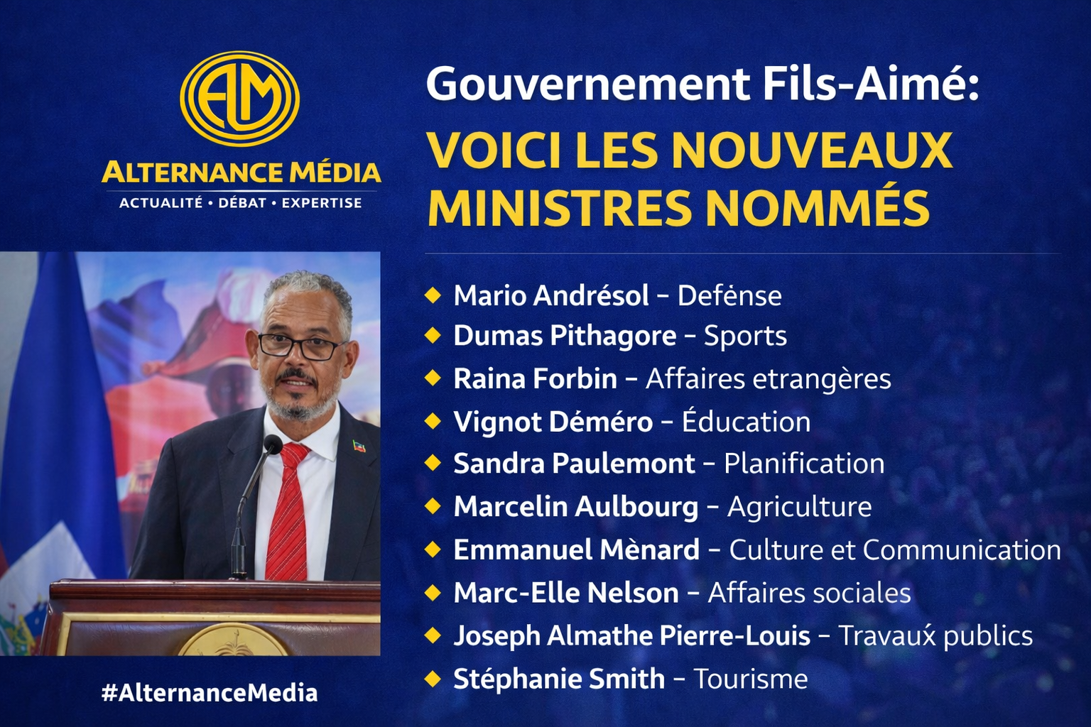 Le gouvernement dirigé par Alix Didier Fils-Aimé a procédé à la nomination de onze nouveaux ministres lors du Conseil des ministres du 2 mars 2026.