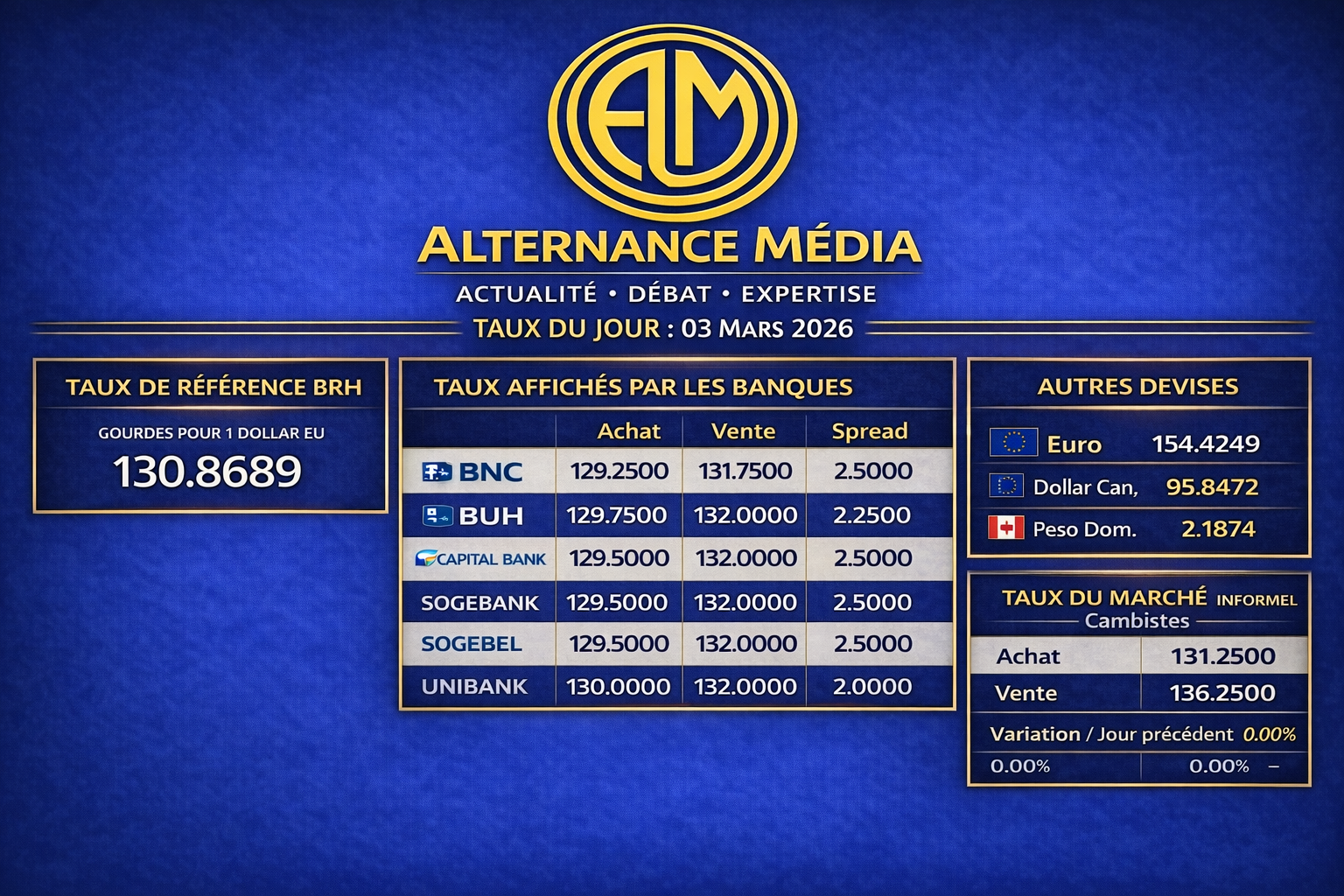 Le taux de référence publié par la BRH s’établit ce 3 mars 2026 à 130.8689 HTG pour 1 USD, traduisant une stabilité nominale par rapport à la séance précédente.