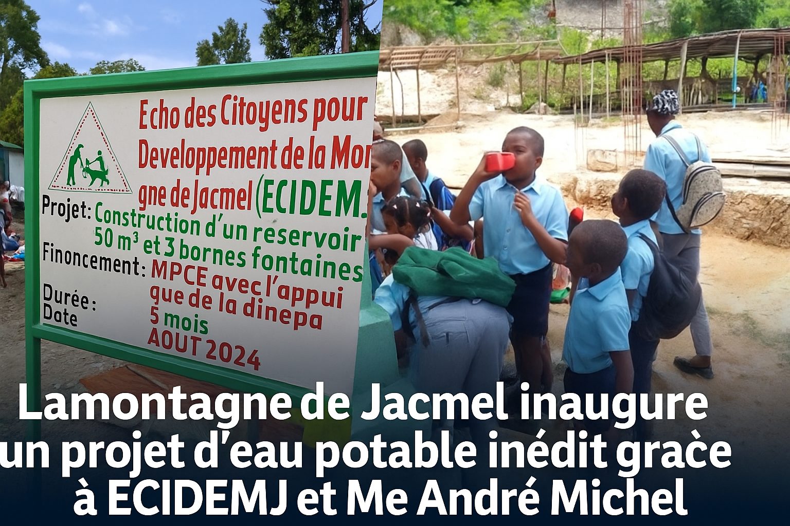 Lamontagne de Jacmel, Sud-Est – Après des années de pénurie chronique, la localité de Lamontagne de Jacmel franchit enfin un cap majeur : l’accès régulier à l’eau potable devient une réalité grâce à un projet hydraulique d’envergure porté par ECIDEMJ (Écho des Citoyens pour le Développement de Lamontagne de Jacmel), avec l’appui déterminant de Me André Michel, natif de la zone.