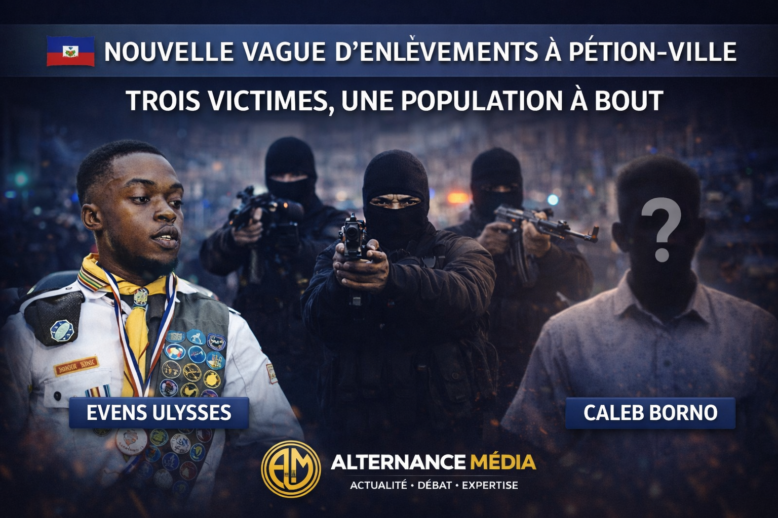 Dans la nuit du 3 au 4 avril 2026, trois personnes ont été enlevées à Pétion Ville par des individus armés. Parmi les victimes figurent Evens Ulysses et Caleb Borno, tandis que l’identité de la troisième personne reste inconnue à ce stade.